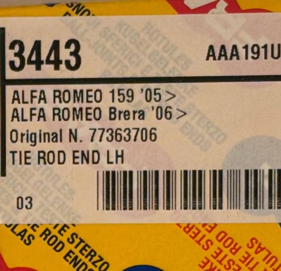 Image Image Image 1 2 3 Tie rod outer right Alfa Romeo 159 Brera Spider 77363706 FR3443 SKU SUSTFR3443 Steering 159 340,00 NOK inkl. 25% MVA In Stock